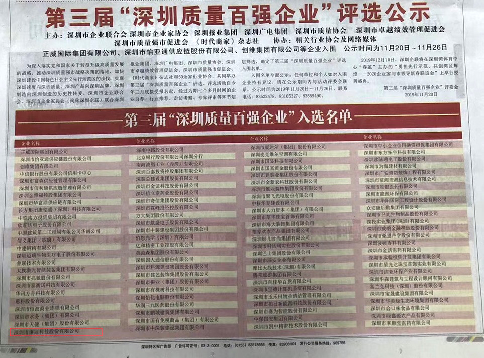 为深入贯彻党和国家关于转型升级高质量发展的战略,推动深圳质量强市战略决策的落地,加速深圳高质量高标准发展先行示范区,深圳市企业联合会、深圳市企业家协会召开第三届“深圳质量百强企业”评选新闻发布会,该评选活动得到了市政府的重视和支持,并由市场监督管理局等部门给予专业指导,经专家评审和网上公示等程序,6686体育被评为“深圳质量百强企业”。