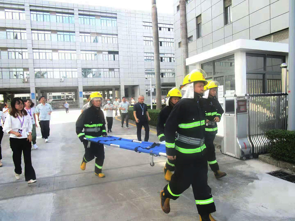 15:30,消防警报铃声响起,各楼层员工们迅速动身跑向安全疏散通道,各楼层疏散组消防负责人则快速到达各关键出口,引导员工第一时间向篮球场安全撤离。与此同时,抢救组成员全副武装,时刻准备前往抢救、救护伤员,警戒组则派员接应消防车。