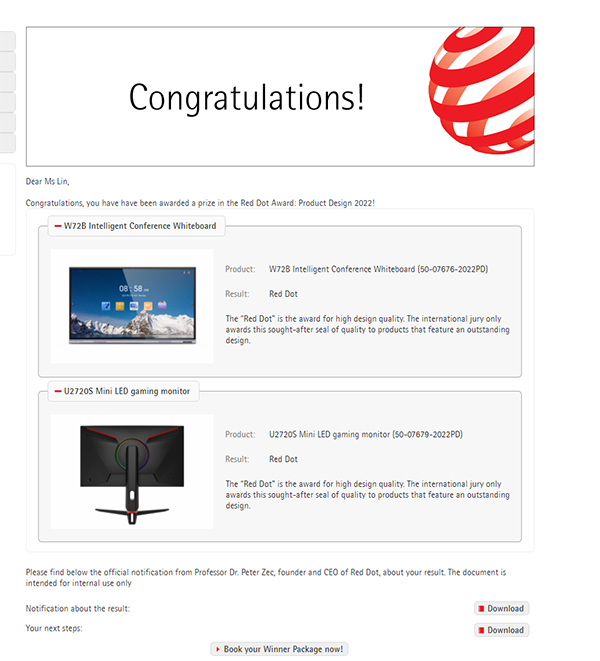 2022年德国红点产品设计奖和iF设计奖评选结果先后揭晓,6686体育产品捷报频传。公司自主研发设计的W72B智能会议白板、U2720S Mini LED 电竞显示器荣获红点产品设计奖;43M31UKT 智能运动镜荣获iF设计奖。