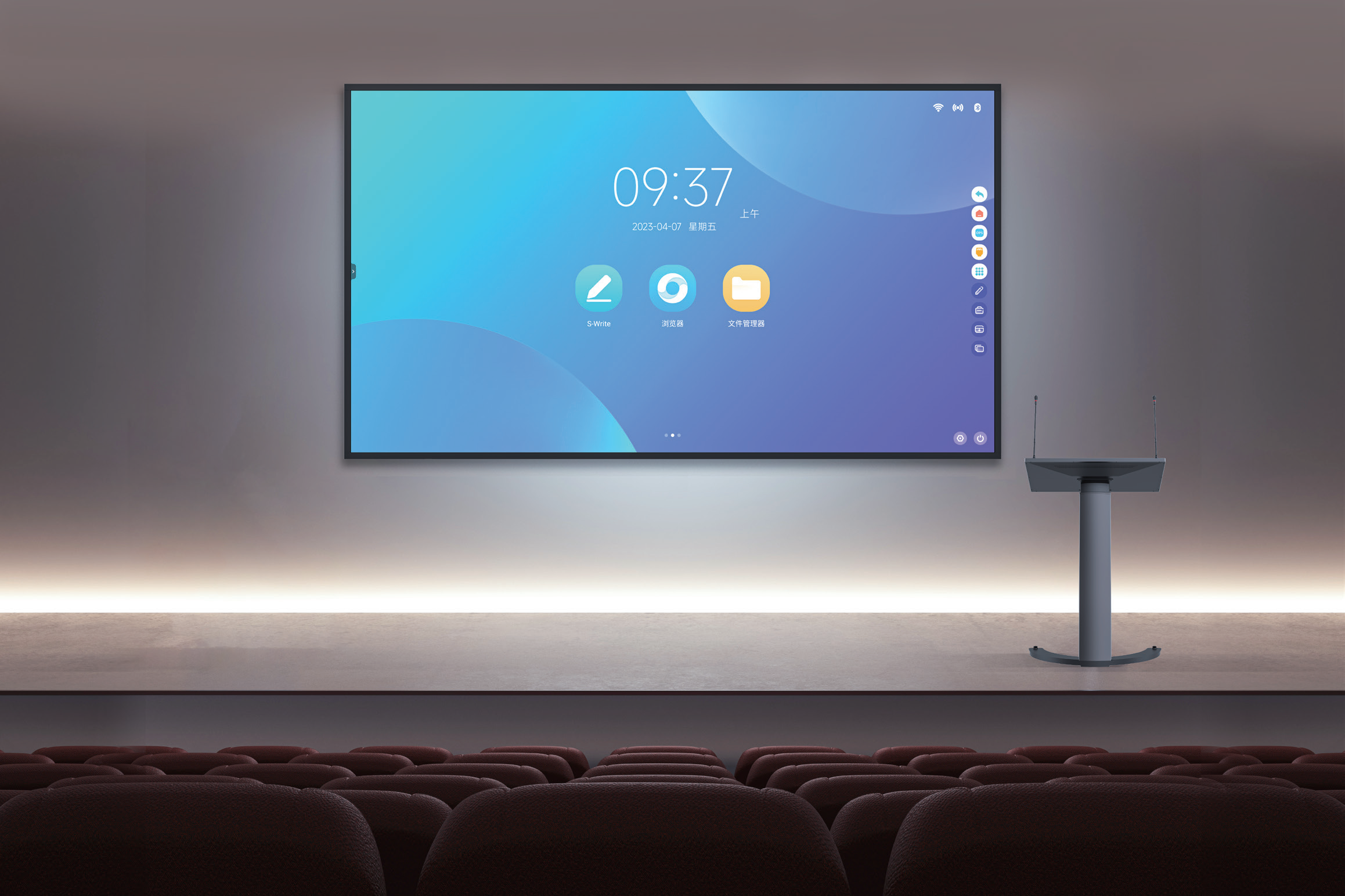 内嵌27英寸4K超清显示全贴合电容触摸屏,可通过有线同屏或无线传屏控制LED巨幕或智能交互平板大屏,使用户在大会场场景下轻松“小屏控大屏”;内置静音电机实现电动平滑调节屏幕高度,并且屏幕倾斜角度满足人体工学设计,为用户提供舒适的书写体验;底座配备双脚轮可轻松移动智能讲台,方便用户根据会场空间灵活部署。